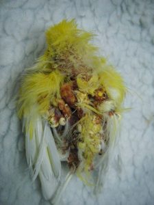 En lo que se refiere al cuadro clínico que presentarán las aves, el aspecto será más o menos «normal«, eso sí, con el plumaje a veces muy desordenado debido a la presencia de estas anomalías en el plumaje. Aunque se tratan de quistes muy molestos para las aves, a veces, por su enorme tamaño, normalmente no suponen ningún tipo de problema para el ave, al menos en lo que a su supervivencia se refiere. Los quistes empiezan a aparecer como plumas con cierta malformación, completamente detectables a ojos de un criador experimentado.